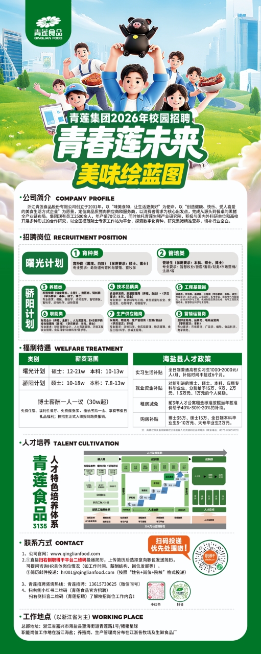 亲爱的同学们,青莲食品将于10月17日(周五)下午15:00在动物科学技术学院318报告厅举办广西大学专场招聘宣讲会,本次招聘聚焦食品质量工程师、品控、研发、育种、兽医、机械工程师、人事、财务、生产和市场等岗位,具体信息见招聘简章,线下投递简历优先筛选!宣讲会现场更有各种零食试吃和礼品赠送!