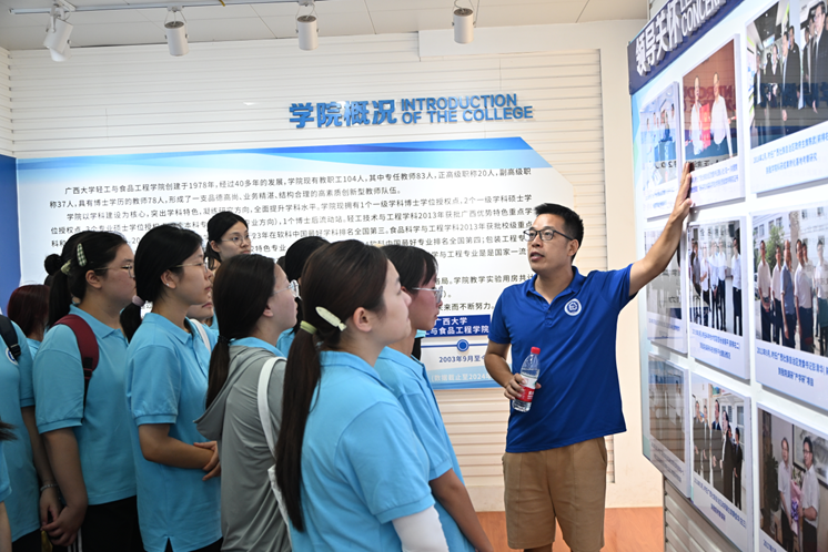 在学院一楼展厅,新生们在食品科学与工程系李树波老师,轻化工程系罗青柳、杜博宇老师的引领下,系统了解了学院的发展历程、学科特色以及以王双飞院士为代表的师资团队和科研成果。从制浆造纸技术的技术革新、造纸污染控制的突破,到广西甘蔗制糖与特色食品加工的科研成果丰富的内容增强了新生对专业的认同与期待。