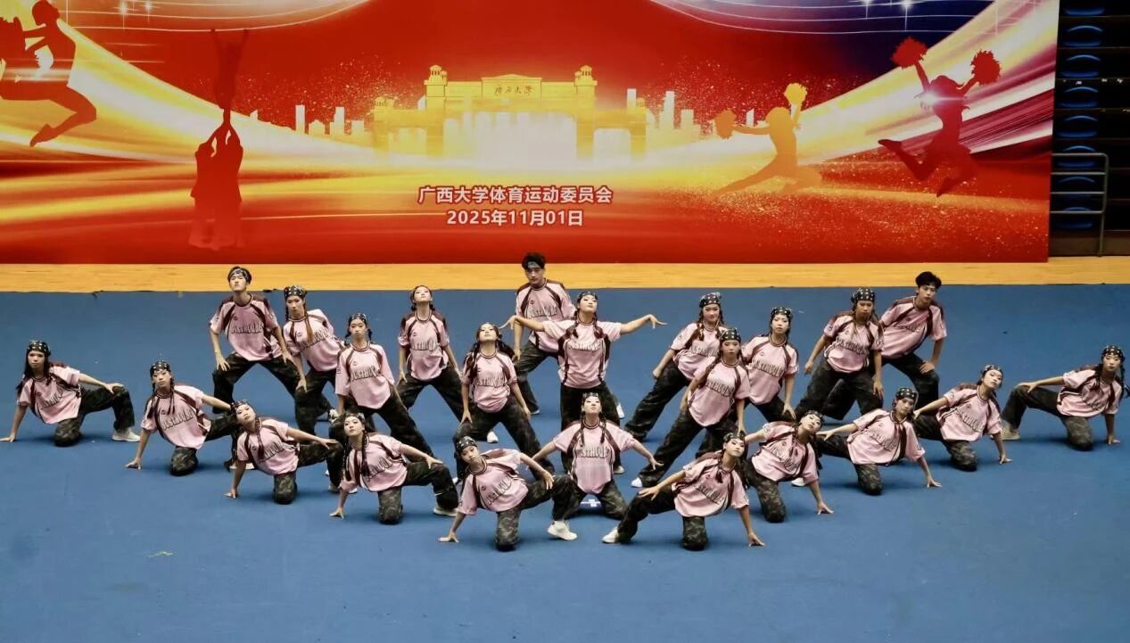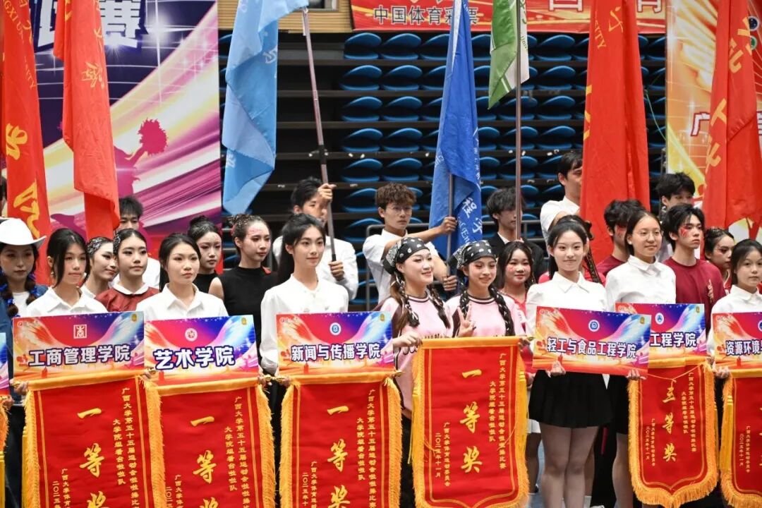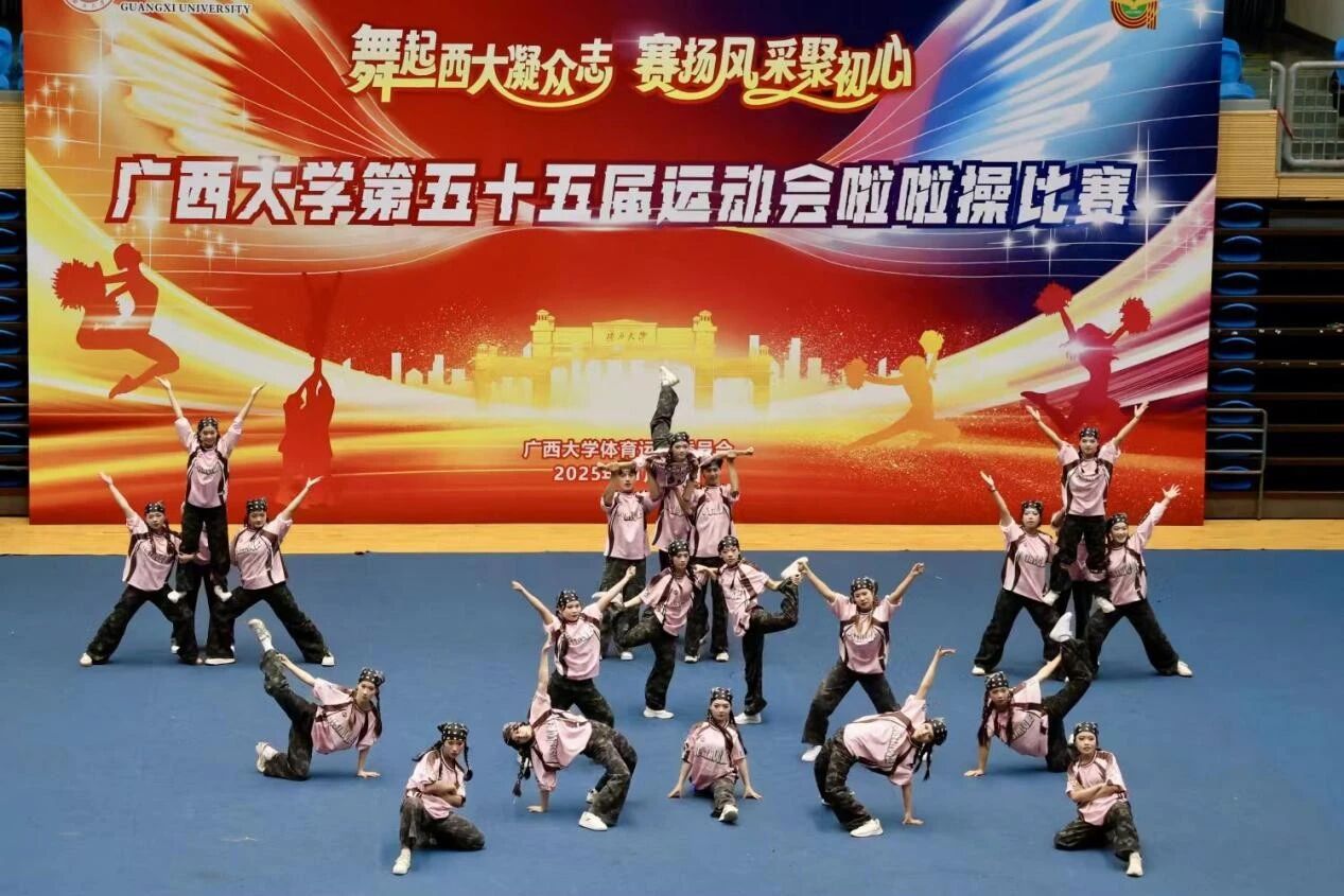 11月1日,广西大学第五十五届校运会啦啦操比赛在西校园体育馆隆重举行。我院代表队凭借出色表现,荣获大学院组二等奖、看台奖一等奖和体育道德风尚奖三项大奖,陈诗茵同学获评"优秀运动员"称号。