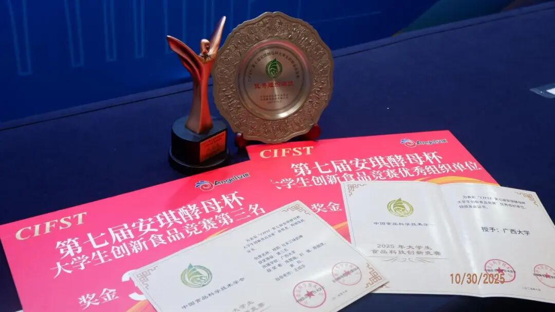 10月30日,中国食品科学技术学会第二十二届年会正式公布了“CIFST-第七届安琪酵母杯大学生创新食品竞赛”的终评结果。我院在本届比赛中表现优异,载誉而归:项目“桂韵·壮乡三味奶啤”荣获创新产品类第三名;三部短视频作品“小酵的奇妙世界”“酵母—小微生物有大作为”“魂穿饥荒年,我用酵母蛋白让全村吃饱饭”均斩获趣味科普类最佳科普奖;同时,我校荣获唯一的“优秀组织单位”称号。