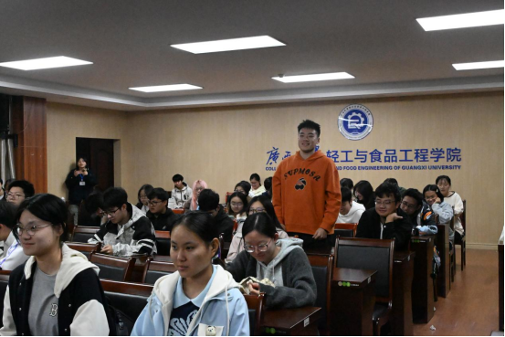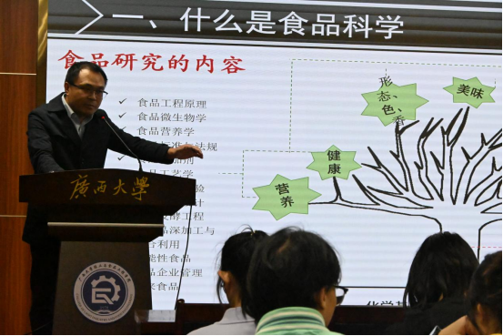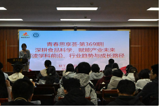 2025年11月19日晚,广西大学轻工与食品工程学院在学院604报告厅成功举办了“青春思享荟”第369期专题讲座。本次活动以“深耕食品科学,赋能产业未来”为主题,特邀学院食品科学与工程专业王成华教授担任主讲,共130余名学生参与。