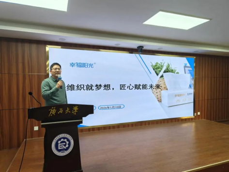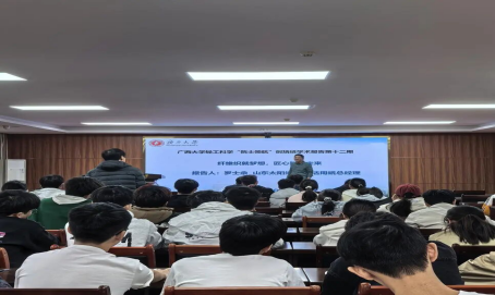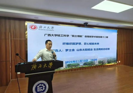 1月10日下午,广西大学轻工科学“院士领航”创培班第十二期学术报告活动在我院604报告厅举办。山东太阳纸业有限公司生活用纸总监、高级工程师罗士余受邀担任主讲人。活动由轻化工程系主任何辉主持,2024级、2025级创培班学生及学院青年教师等百余人参加。