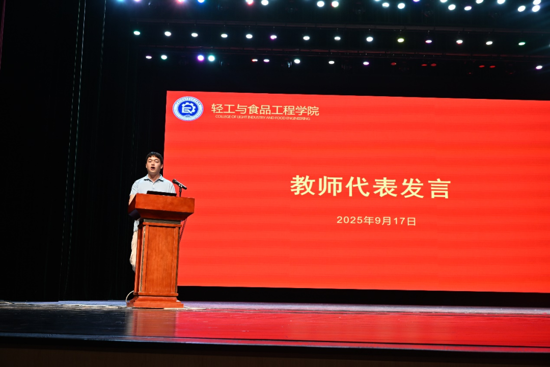 随后,食品加工与安全专业2023级硕士焦道权作为老生代表分享了大学经历与经验,他回顾了自己在轻工与食品工程学院六年来的求学经历,从初入校园的懵懂到扎根科研的坚持,逐步领悟到“轻工食品”并非“吃喝”之学,而是关乎民生安全、绿色发展和产业进步的“大文章”。他向新生分享了敢于尝试、夯实基础、融入集体的三点建议,鼓励他们在实验与实践中探索方向,在团队与奋斗中收获成长。他表示,作为轻工人,应将专业能力融入国家所需,以青春之力挺膺时代担当。