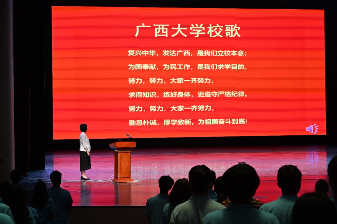 庄严的国歌旋律拉开仪式序幕,点燃现场氛围。轻工252班邓博作为新生代表发言,他分享了自己因驻村书记与广西大学结缘的故事,表示以“西大轻工人”为荣,融入八桂热土,锤炼本领,服务家乡;愿与同学们并肩,传承“锄头主义”“三拼精神”,书写新时代青春答卷。