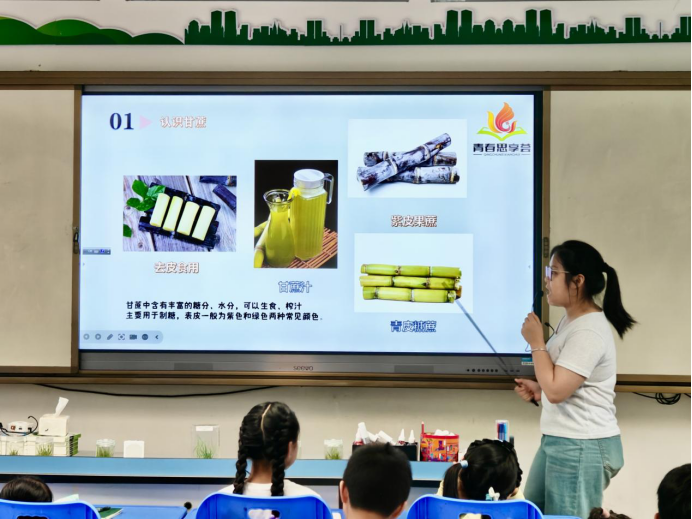 随后,聚焦甘蔗产业本身,广西大学农学院的梁莉茜与韦金辰,围绕甘蔗基础知识展开讲解,深入剖析了甘蔗产业的经济价值及其在国家战略层面的重要意义,全面展现出广西大学在甘蔗研究领域的深厚积淀与卓越实力。她们分享了广西大学在甘蔗新品种培育、关键种植技术研发等方面的亮眼成果,并创新借助“彩虹糖色素扩散”趣味实验,将抽象的农业科学原理直观呈现,色彩斑斓的实验现象瞬间点燃了同学们的求知欲,让大家在惊叹中感受到了农业科学的独特魅力,也深刻认识到蔗业、糖业对国计民生的重要性。