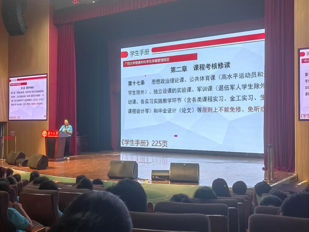 林莹副院长首先对本科生学籍管理规定进行了系统解读,涵盖广西大学学生处分规定、考核与成绩记载、转专业与推免、综合测评办法及毕业与学位授予条件等重要内容,并结合典型案例拆解政策细节,既明确“红线”,也厘清学业发展路径,帮助新生全面理解学籍管理制度。随后,她带领新生学习《广西大学学生手册》,重点讲解校园纪律、奖惩制度与生活服务等方面,以深入浅出的方式使新生对校园生活形成清晰认知,并围绕课堂考勤、宿舍生活准则及课余活动规范等日常管理事项进一步说明,引导学生树立遵规守纪的良好行为习惯。