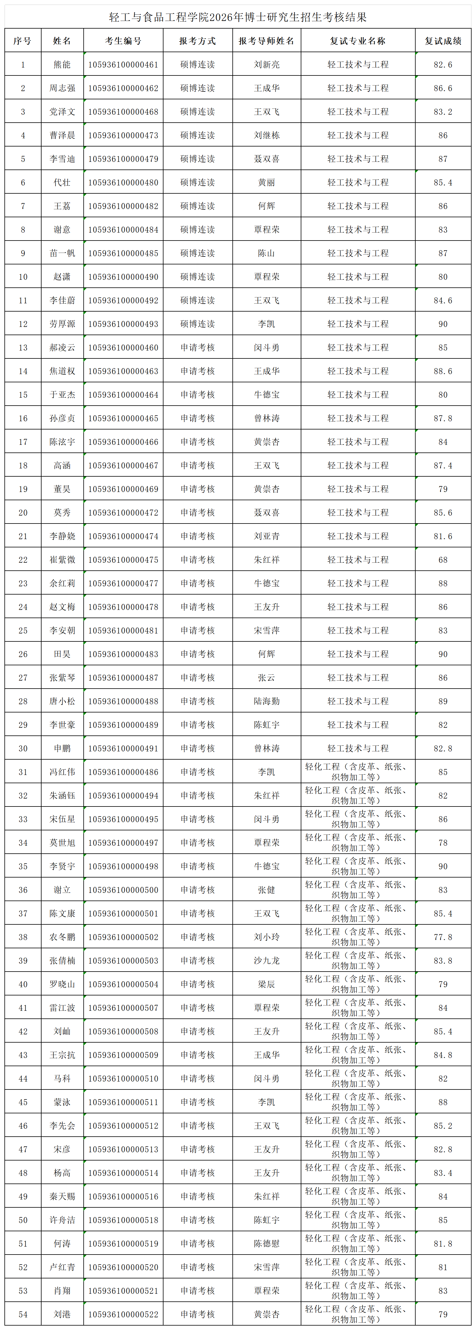 根据《广西大学2026年招收攻读博士学位研究生简章》《广西大学轻工与食品工程学院2026年博士研究生招生考核录取工作实施细则》等文件精神,学院于3月20日完成复试工作,现将考核结果公布如下: