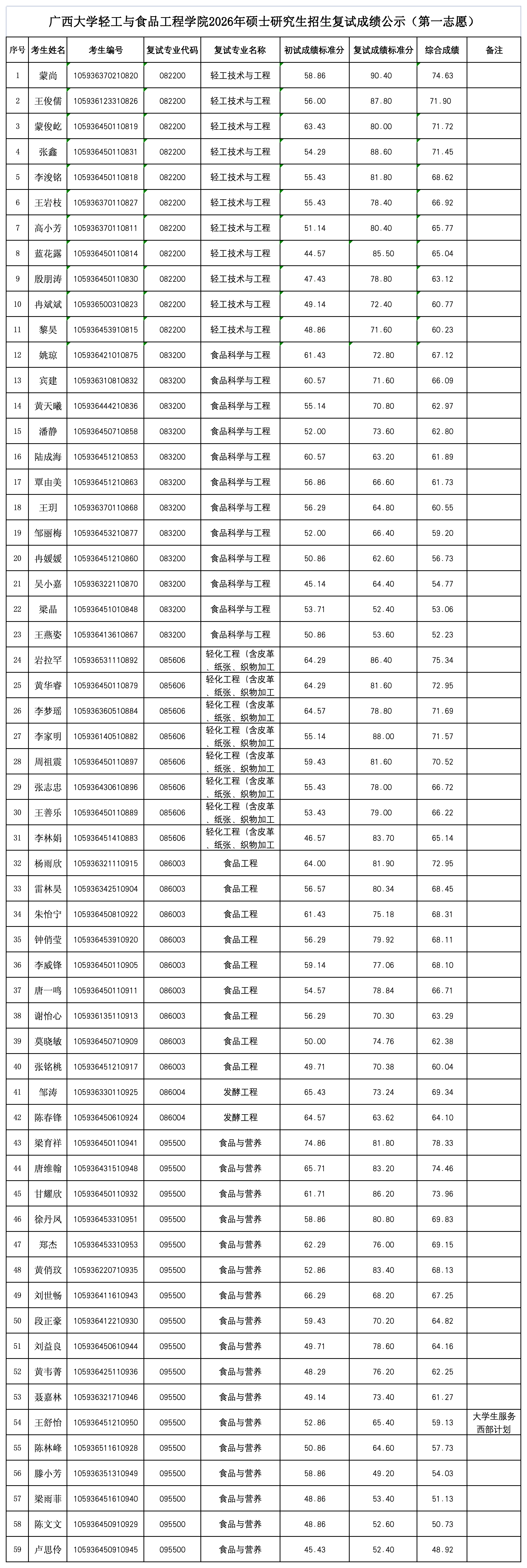根据《轻工与食品工程学院2026年硕士研究生招生复试录取实施细则》的要求,我院于2026年3月29日组织2026年硕士研究生招生复试工作。现将复试成绩(第一志愿)予以公布。复试成绩详见下表。